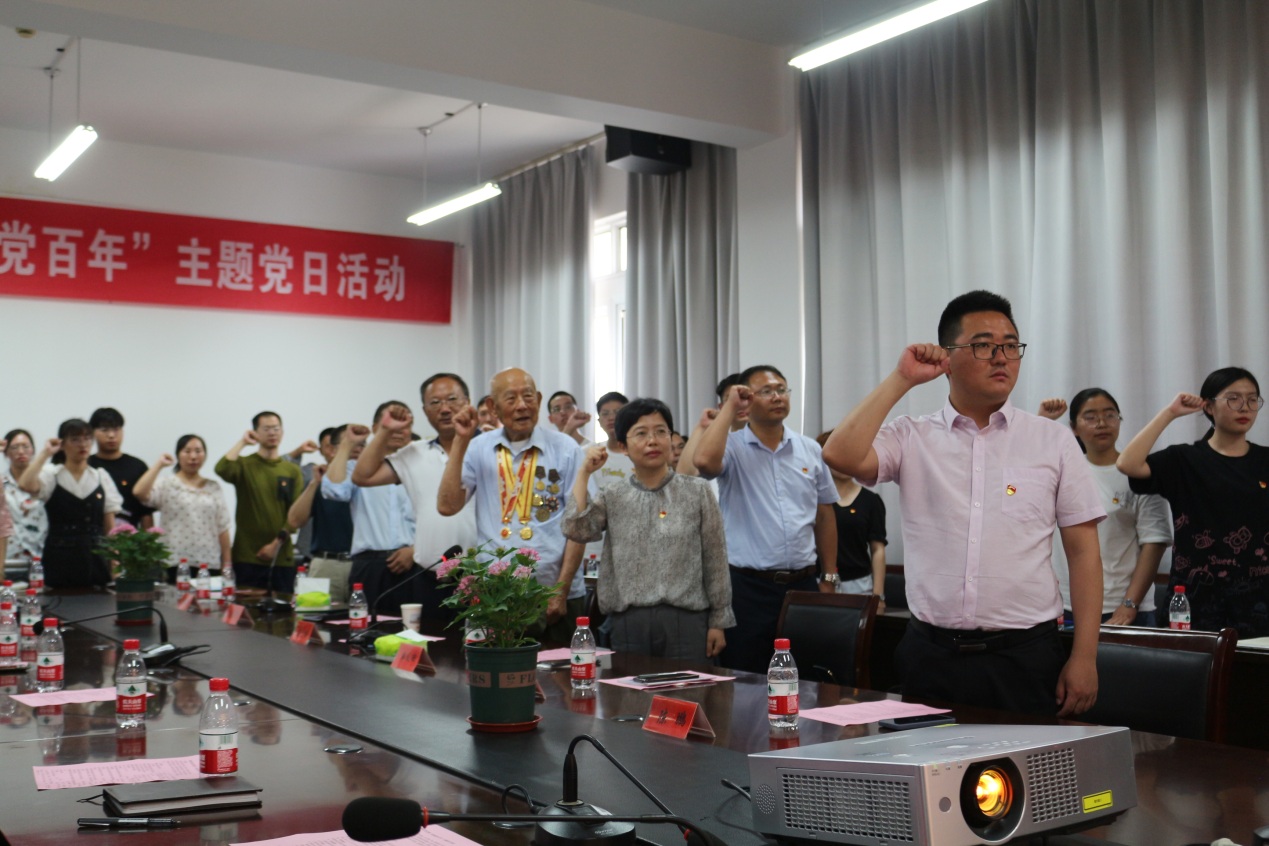 全体师生党员和周竹林一起,面向党旗,举起右臂,重温入党誓词。
