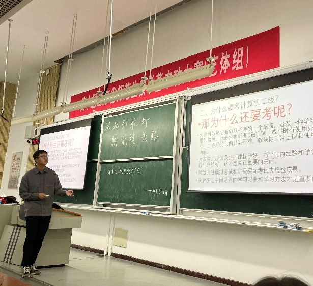 帮助大一新生了解计算机二级考试的趋向,明了考试重点,学院自律会学习部利用新生入学教育契机,于2022年10月15日晚七点在综合楼C102教室举办了以“举起引航灯,照亮过关路”为主题的计算机考级经验分享会。