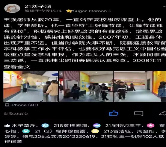 认真严密思。学习王强老师先进事迹之后,同学们以博文形式来表达自己的学习感悟,并通过“微博转发,微信点评”活动来交流学习心得,将“王强精神”真正内化与心。同学们在感悟王强老师“执着、奉献、求真、拼搏”精神的同时,也深刻意识到新时代青年的使命担当,青年大学生要在担当中历练,在尽责中成长,坚定马克思主义信仰,中国特色社会主义信念,中华民族伟大复兴的信心。