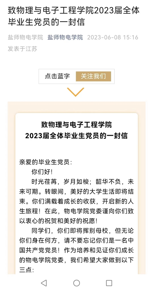 一封信寄托学院对学生党员的殷切希望。毕业之际,学院党委向毕业生党员发出致mg4355vip检测中心2023届毕业生党员的一封信。送出衷心祝贺的同时,也对毕业生党员提出三点要求,希望全体毕业生党员能够努力做到:一是不忘初心,坚定信仰;二是牢记使命,播撒信仰;三是敢于斗争,维护信仰。