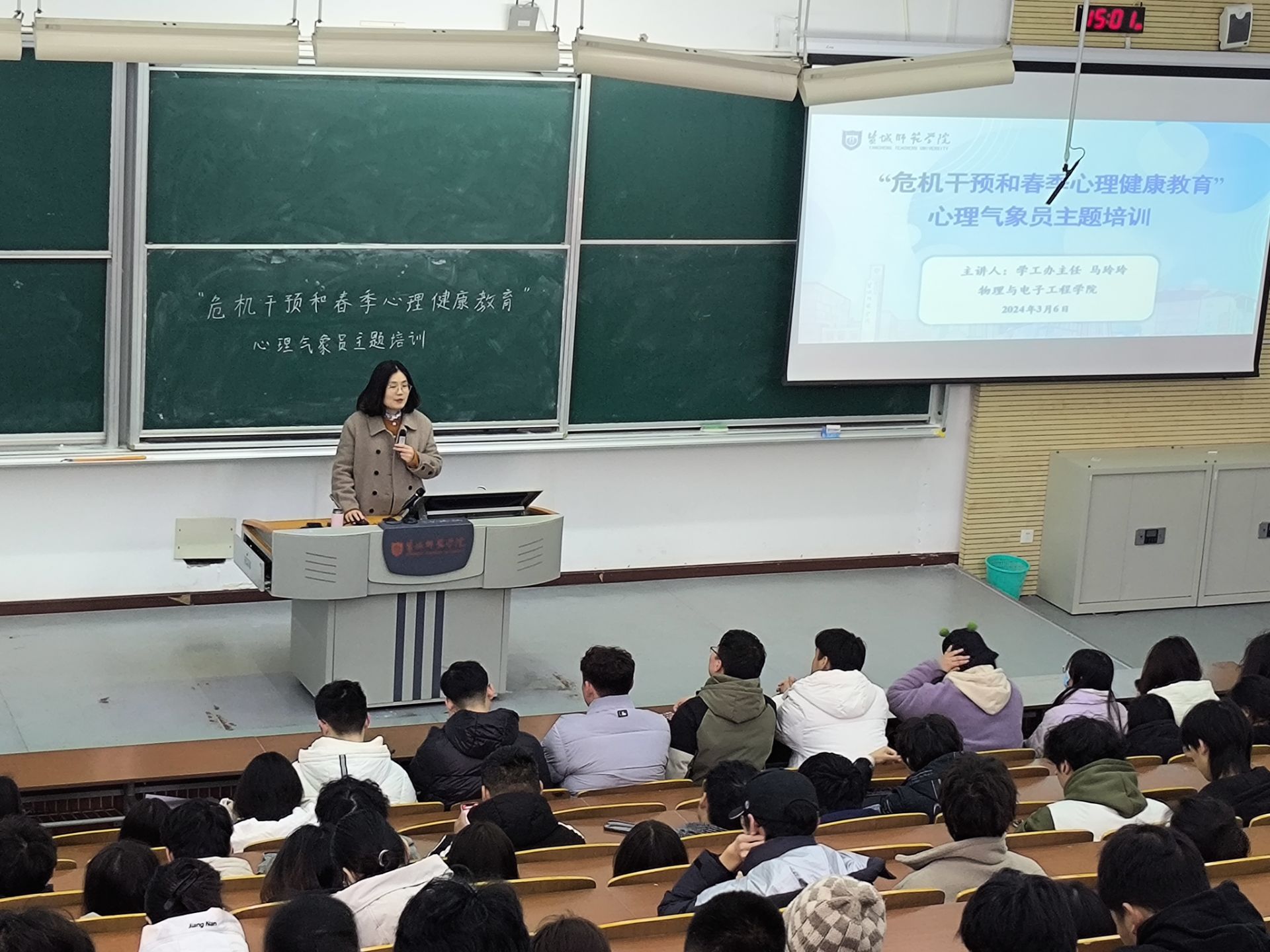 2024年3月6日下午,mg4355官网在公共教学楼C201开展了一场以“危机干预和春季心理健康教育”为主题的心理气象员主题培训。本次培训由学工办主任马玲玲主讲,全体心理气象员参加培训。
