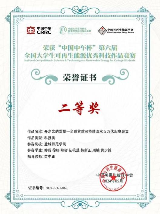全国大学生可再生能源优秀科技作品竞赛是由中国可再生能源学会主办的全国性大学生课外科技作品竞赛,是一项具有导向性、创新性的全国性大学生科技竞赛。本次大赛吸引了全国326所高校2624支队伍、15000多名大学生报名,参赛高校、队伍、人数均创历届新高,收到参赛作品1953项,1768项进入技术初评。经初赛、南北赛区复赛,最终共有131支队伍晋级决赛。通过PPT陈述、模型展示、内容答辩等环节,mg4355官网mg4355vip检测中心乔聪、徐杨、韩新正、周楠、郑密、征杭慧、黄少铖团队(指导教师:苗中正)的作品“开尔文的雷暴——全球首款可持续滴水百万伏起电装置”荣获全国二等奖。
