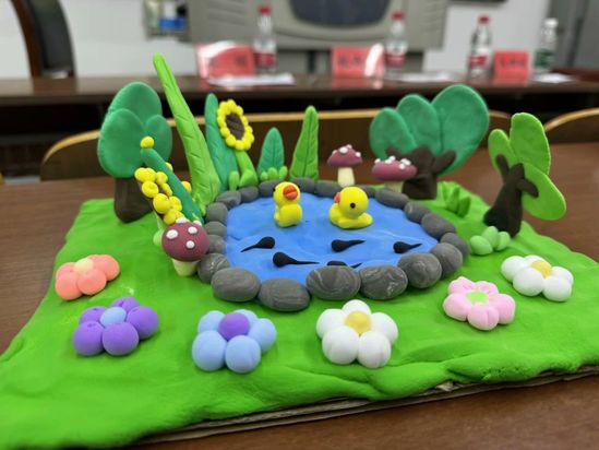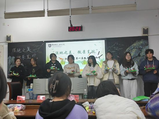 在活动当天,学生们积极参与,使用超轻粘土精心制作湿地微景观。制作过程中,通过团队协作,大家深入探索湿地生态系统中的微观领域,共同绘制出一幅幅展现自然的微观画卷,充分展示了出色的创新实践能力。作品完成后,各小组派出代表,从主题、立意、创作灵感等方面详细介绍了各自的作品。每个小组清晰而详尽地呈现了湿地中那些常常被忽视的美丽,创意与自然的融合令在场的每个人深刻感受到湿地生态系统的多元价值和独特魅力。