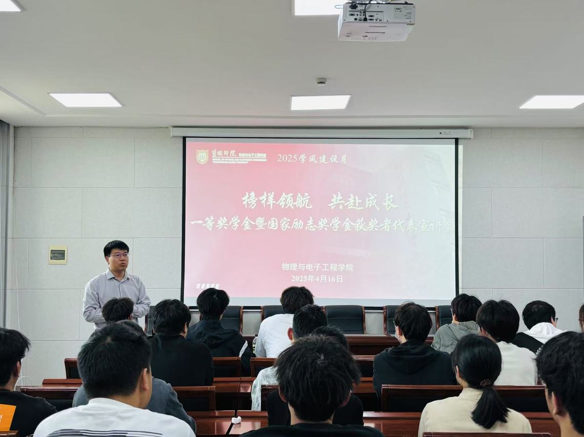 为进一步加强学风建设,充分发挥学习榜样示范引领作用。4月16日下午,mg4355官网在逸夫楼东会议室举办了“榜样领航 共赴成长”一等奖学金暨国家励志奖学金获奖者事迹宣讲会。会议由学工办副主任陈成主持,全体辅导员,奖助学金获得者代表,2023级、2024级学生代表参会。