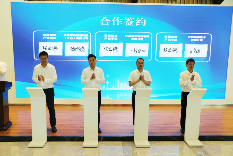 唐高明、戴斌荣共同为产业学院揭牌。大数据集团有限公司党委书记、董事长朱亮亮向张宏如移交产业学院场地钥匙。智能传感产业学院院长张志海分别与呈像应急装备科技(江苏)有限公司、江苏芯丰集成电路有限公司、江苏冉能技术有限公司等企业负责人现场签约。